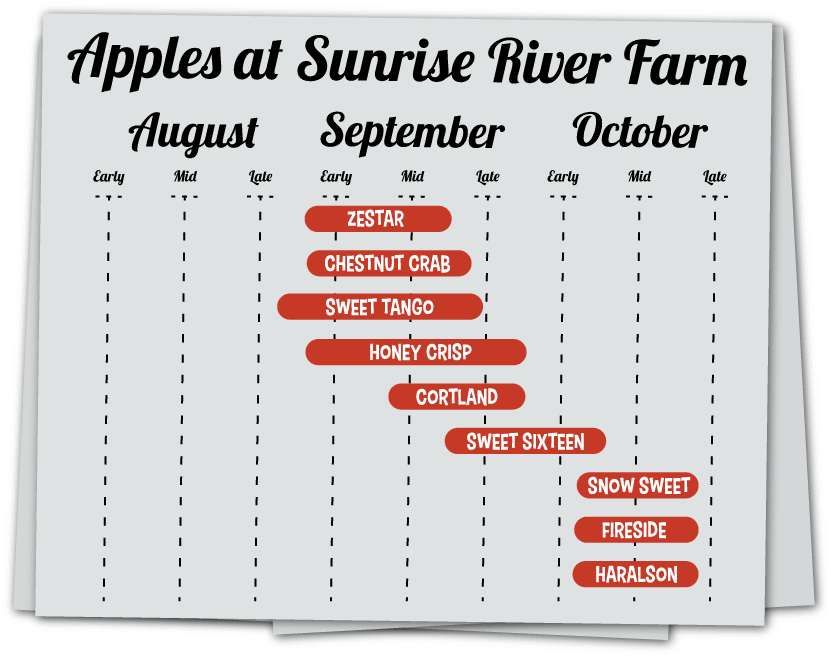 Wondering when your favorite apple will be ready for harvest? Check out our ripening calendar below to find out!